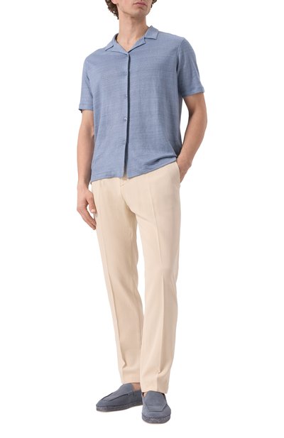 Брюки Bard с застежкой button fly выполнили из слегка эластичного твила на основе хлопка и лиоцелла. На одном из пяти карманов вышили эмблему марки в тон, а пояс сзади дополнили брендированным патчем из сафьяновой кожи. В комплекте — платок с мозаичным узором.