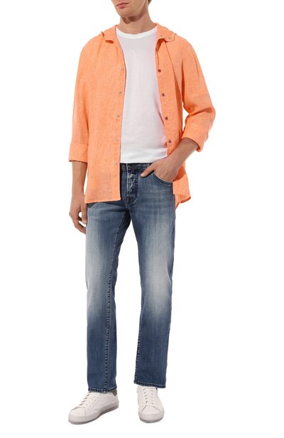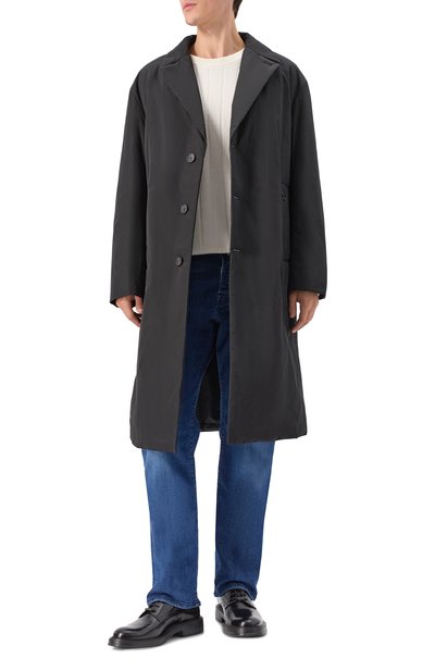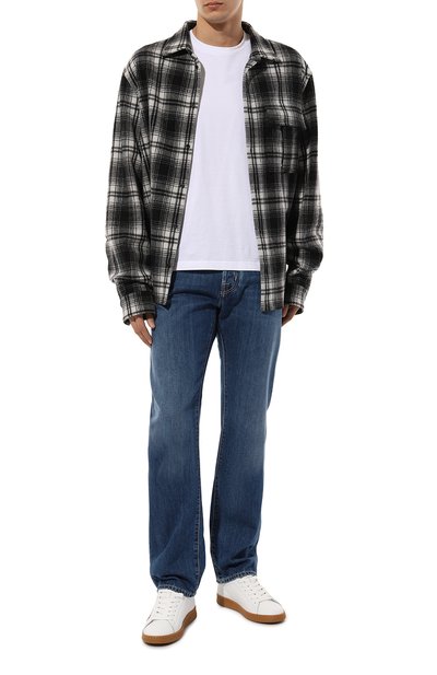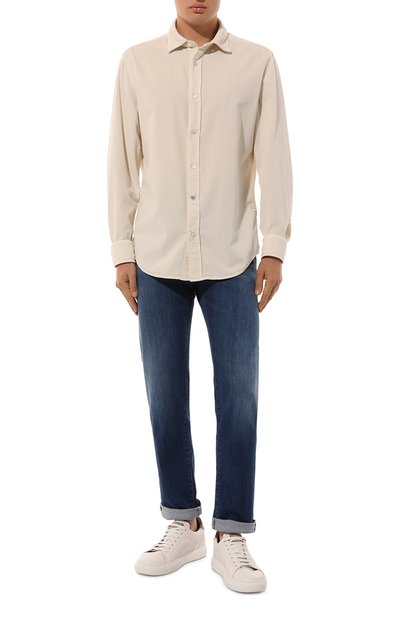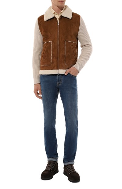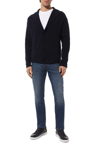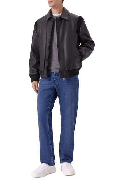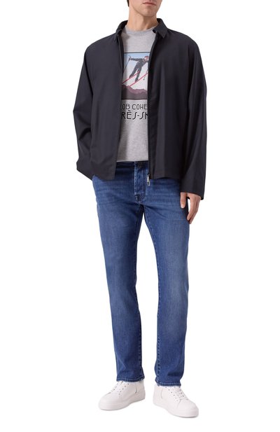 Зауженные джинсы с фирменным цветочно-древесным ароматом выполнили из стрейчевого денима. Модель с пятью карманами и ширинкой на потайных пуговицах декорировали вышитой эмблемой сбоку и кожаным патчем с тисненым логотипом сзади. В комплекте – платок для полировки фурнитуры.