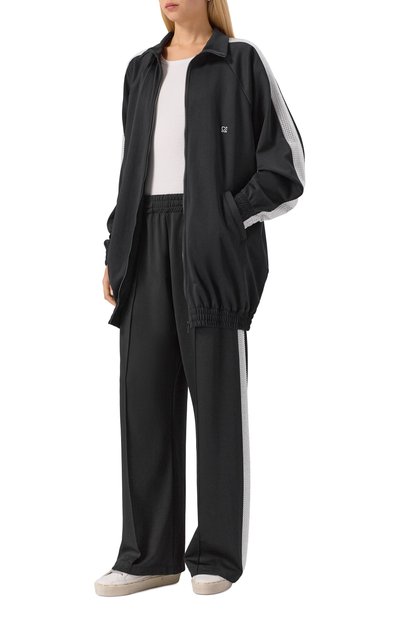 Для п ошива брюк со стрелками использовали тянущийся жаккард на основе полиэстера с добавлением шерсти. Модель дополнили широким брендированным поясом-резинкой, по бокам предусмотрели прорезные, сзади — накладные карманы (на правом — фирменная заклепка).