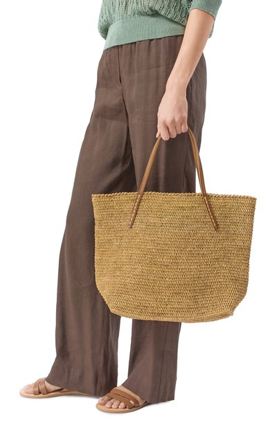 Сумку с рельефным узором из узлов сплели вручную из мадагаскарской рафии. Аксессуар с двумя короткими ручками дополнили плоским текстильным карманом.