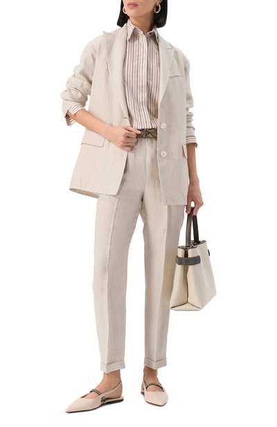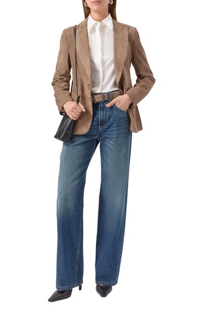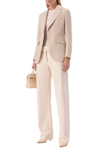 Жакет сшили из полушерсти с добавлением шелка и льна. Приталенную модель с боковыми карманами и шлицей сзади дополнили на спинке фирменной пластиной с логотипом бренда. Предлагаем создать образ с парными брюками.
