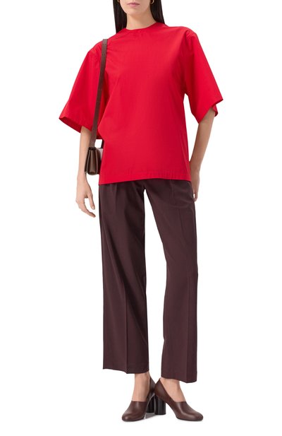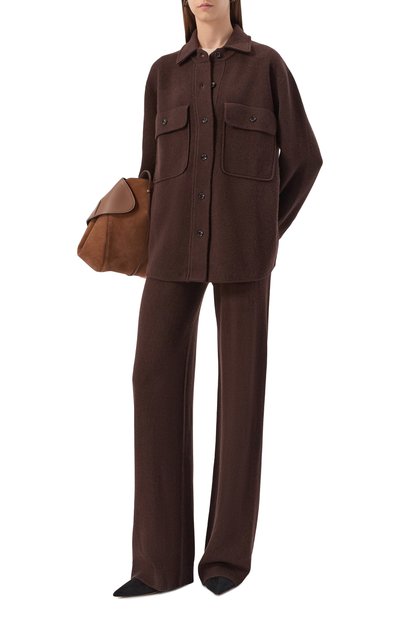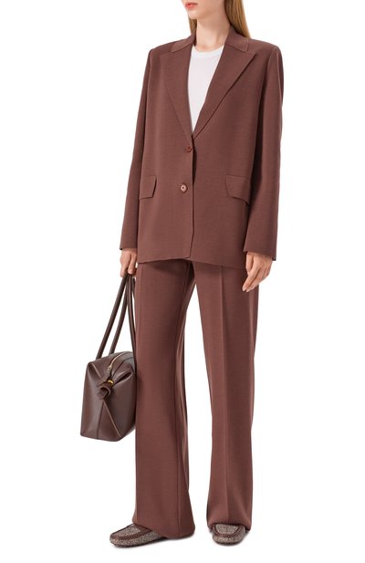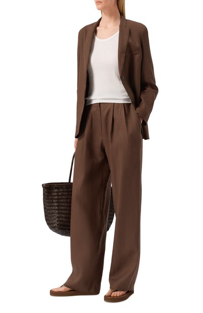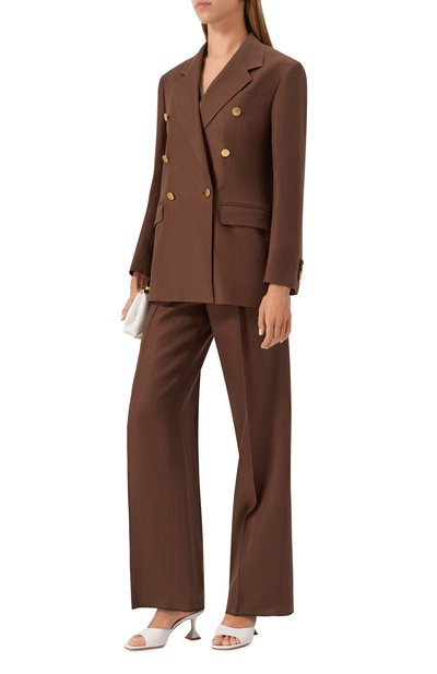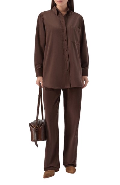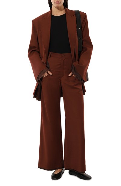 Расклешенные брюки с широким эластичным поясом и парой боковых карманов изготовили из атласа стрейч на основе полиэстера. Предлагаем создать образ с парным топом и сетчатыми сабо.