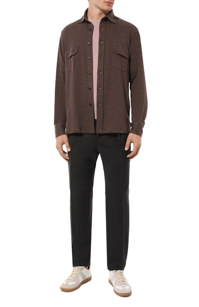 Приталенную рубашку с фигурными кокетками и закругленными манжетами дополнили нагрудными карманами с клапанами. Модель из хлопкового пике застегивается кнопками с перламутровыми кабошонами.