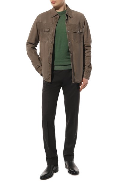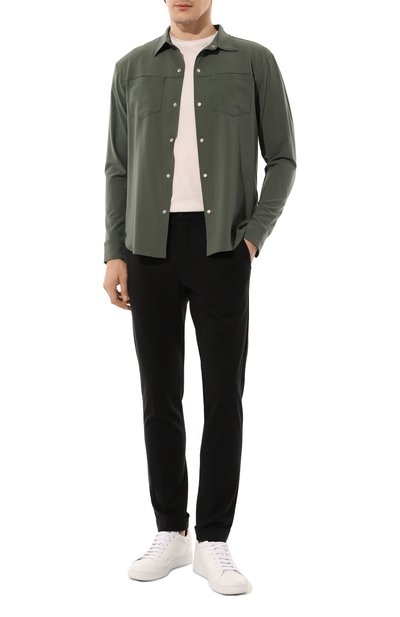Рубашку со скошенными манжетами и нагрудными накладными карманами окрасили в готовом виде. Модель из хлопкового твила застегивается перламутровыми пуговицами.