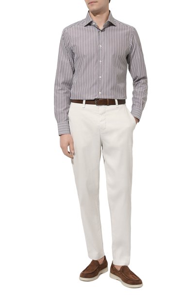 Сорочку Mivara SF силуэта Slim fit выполнили из чистого хлопка в бенгальскую полоску. Само изделие с воротником «акула», как и закругленные манжеты, застегивается на перламутровые пуговицы.