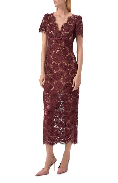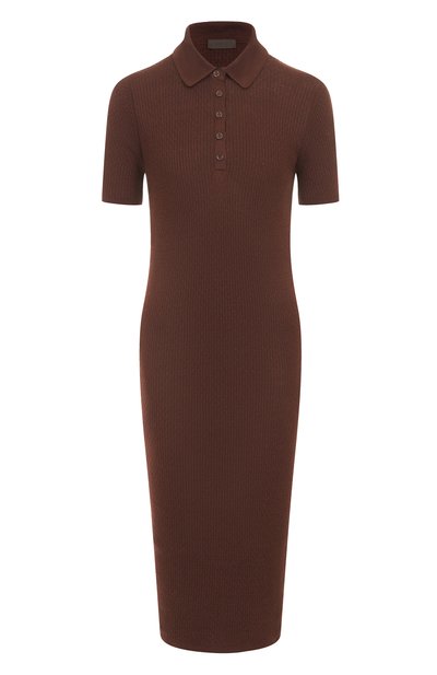 Мини-платье с открытыми плечами сшили из вискозного трикотажа с добавлением полиэстера. Материал хорошо тянется, поэтому модель с небольшой драпировкой под декольте не нуждается в застежке.