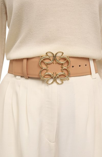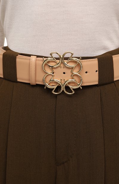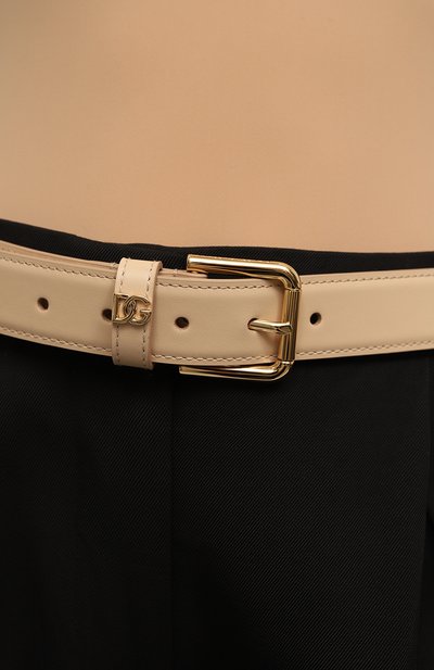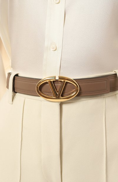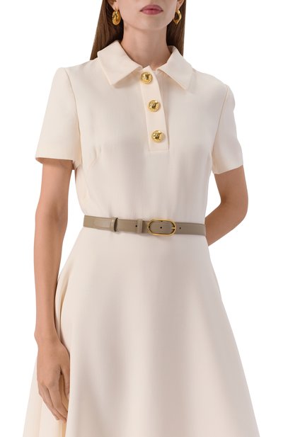 Ремень с двумя тренчиками застегивается золотистой овальной пряжкой. Для изготовления аксессуара средней ширины использовали гладкую телячью кожу.
