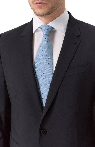 Галстук из шелка с жаккардовым геометрическим узором хорошо драпируется и почти не мнется. Длины однотонного аксессуара хватит, чтобы завязать узел любой сложности.