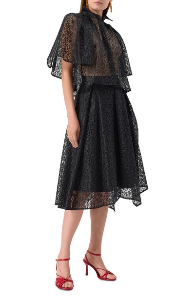 Юбку с эластичным поясом и складкой сзади сшили из нейлонового кружева с цветочным мотивом, подчеркнутым текстильным кантом. Модель составит идеальный дуэт с парным топом.