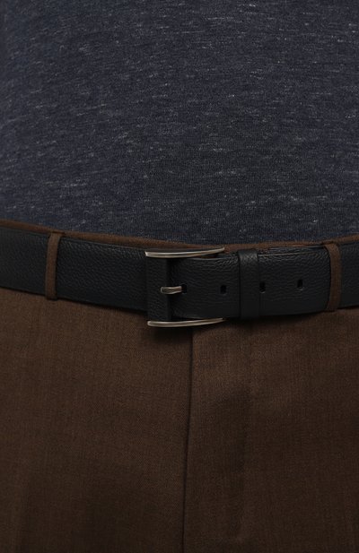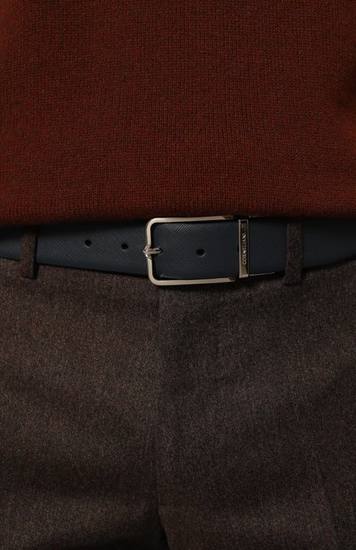 Двусторонний ремень изготовили из гладкой телячьей кожи с одной стороны и крупнозернистой с другой. Аксессуар застегивается металлической пряжкой с брендированным тренчиком, выполненными из металла с рутениевым покрытием.