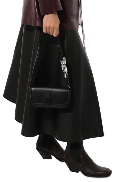 На клапане черной мини-сумки из зернистой телячьей кожи вручную вышили контрастный логотип марки. Модель с магнитной кнопкой дополнили съемным регулируемым ремнем, поэтому ее можно носить не только на плече, но и как клатч.