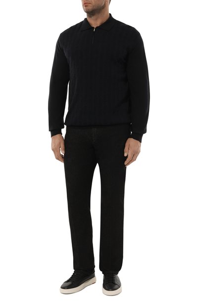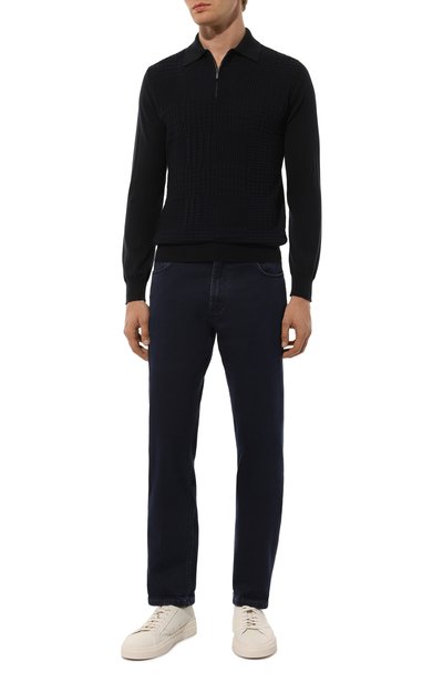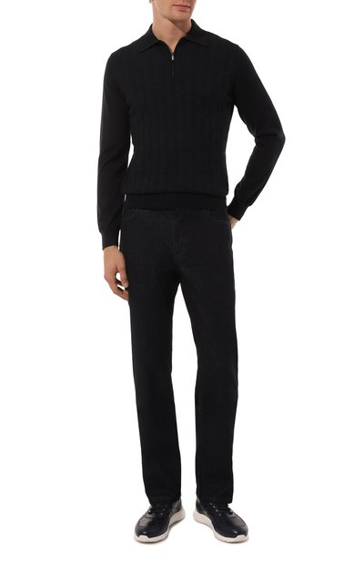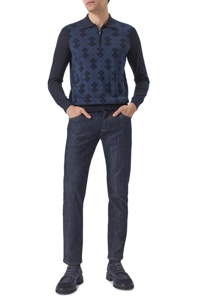 Поло с двухцветным ромбовым узором спереди выполнили из полушерстяного трикотажа с добавлением шелка и кашемира. Модель застегивается короткой молнией с фирменным пуллером.