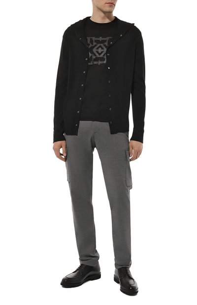 Толстовку с регулируемым капюшоном и двумя карманами выполнили из полушерстяного трикотажа с добавлением шелка и кашемира. Линию плеч подчеркнули полосами. Модель застегивается встречной молнией с брендированными пуллерами.