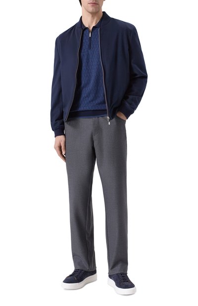Поло с графичным жаккардовым узором спереди связали из микса кашемира и шелка. Модель с поясом и манжетами в рубчик застегивается молнией.