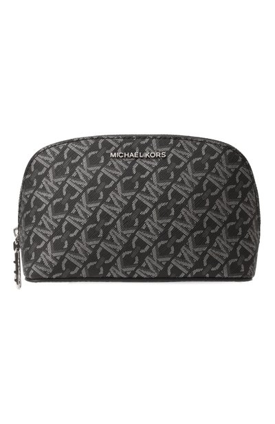 Косметичку с серебристым рельефным логотипом сшили из текстурного холста с полимерным покрытием. Аксессуар с паттерном Empire застегивается молнией с одноименным пуллером из монограммы МК.