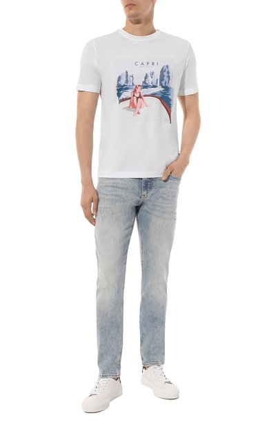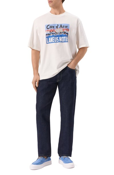 Для пошива футболки с немного спущенной линией плеч использовали джерси из чистого хлопка. Спереди модель украсили крупной надписью Cote d'Azur Surf Club Laneus.