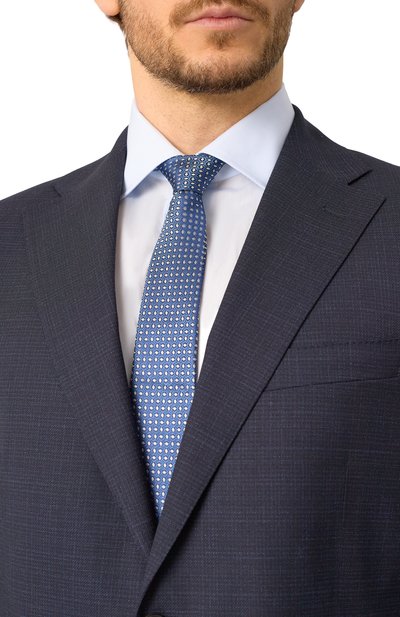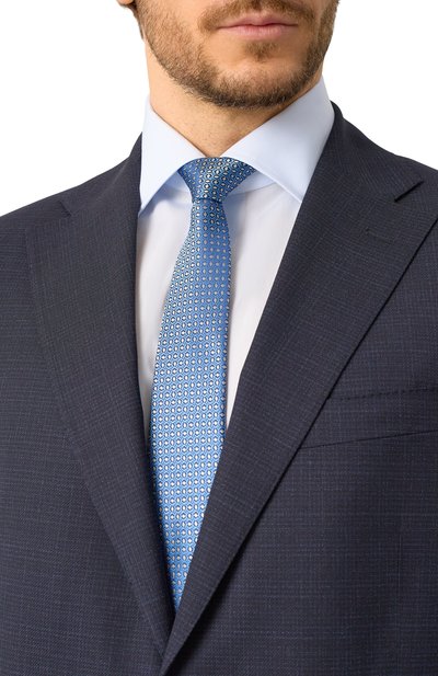 Для пошива галстука на подкладе использовали чистый шелк с жаккардовым геометрическим узором. Аксессуар средней ширины хорошо сочетается как с узкими, так и с увеличенными лацканами пиджака.