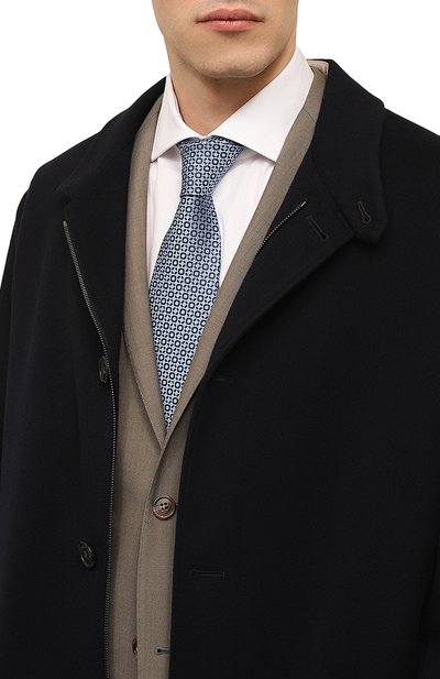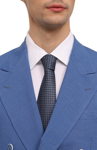 Галстук с геометрическим узором изготовили из шелкового жаккарда. Заготовку сложили особым образом, тщательно заутюжили и прошили единой нитью, поэтому аксессуар не теряет форму и не перекручивается.