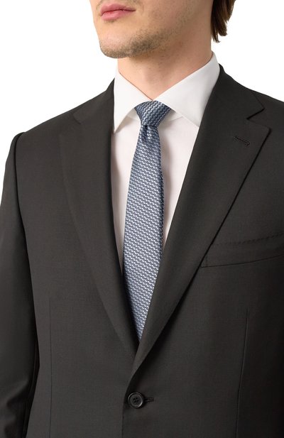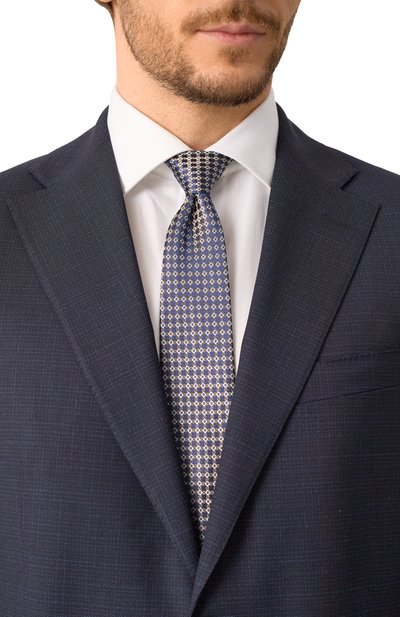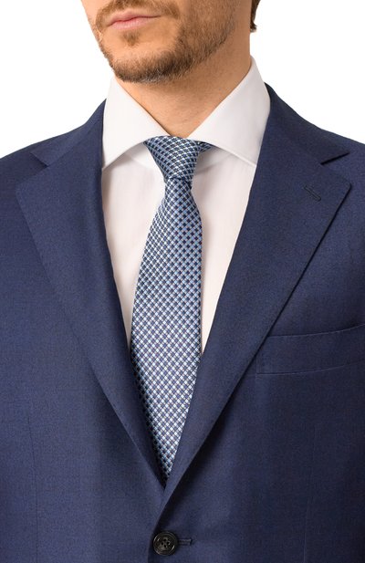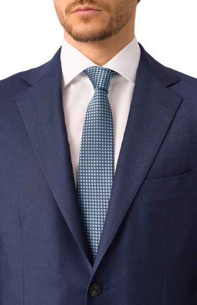 Для пошива галстука с геометрическим узором использовали шелковый жаккард. Благодаря выполненному вручную заднему шву аксессуар не перекручивается и хорошо держит узел.