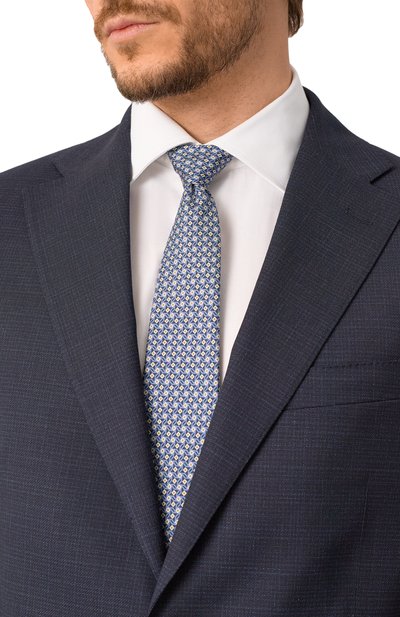 Галстук сшили вручную из шелкового жаккарда с геометрическим узором. Длины аксессуара хватит, чтобы завязать двойной узел.