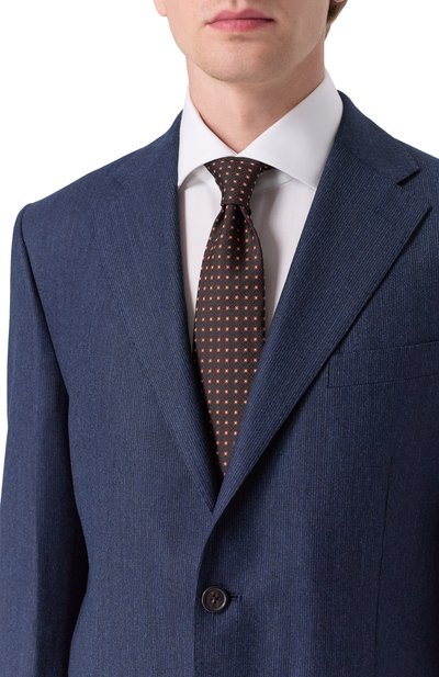 Галстук сшили из шелкового жаккарда с мелким геометрическим узором. На каждом этапе производства аксессуар многократно отпарили, поэтому он надолго сохранит четкость линий.