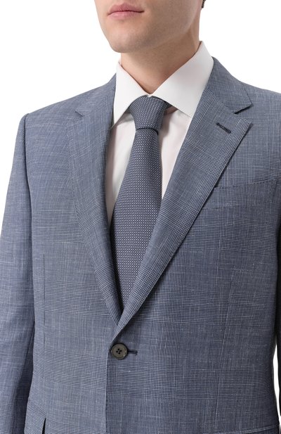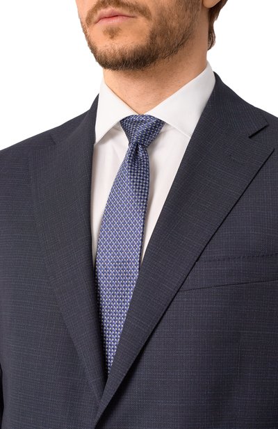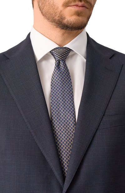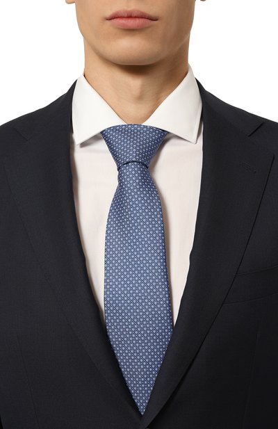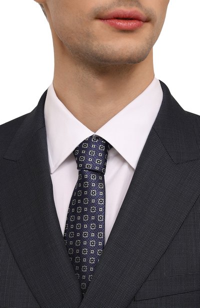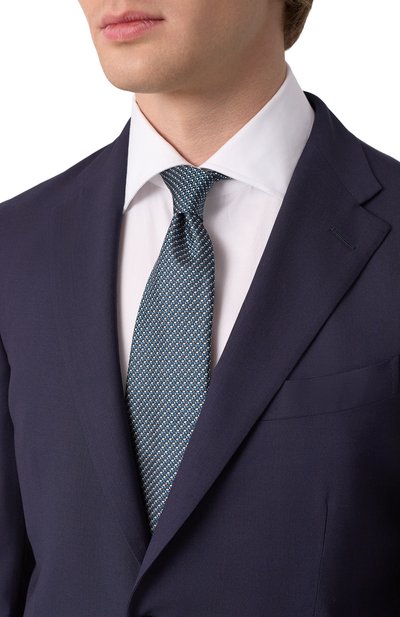 Галстук с геометричным орнаментом выполнили из шелкового жаккарда с добавлением льна. Чтобы аксессуар с подкладом не перекручивался, его зафиксировали эластичным ручным швом.