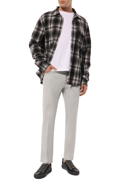 Джинсы с контрастной отстрочкой выполнили из слегка эластичного хлопкового денима. Модель с искусственными заломами традиционно дополнили пятью карманами.