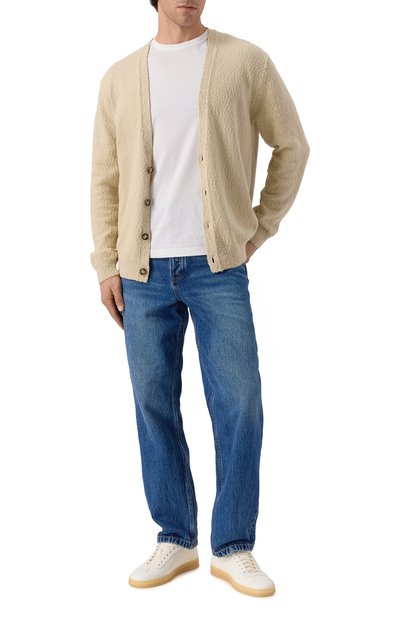 Джинсы с высокой посадкой сшиты из хлопка с декоративными потертостями. Пояс украсили брендированным патчем, которому вторит небольшой ярлык на самом маленьком из пяти карманов.