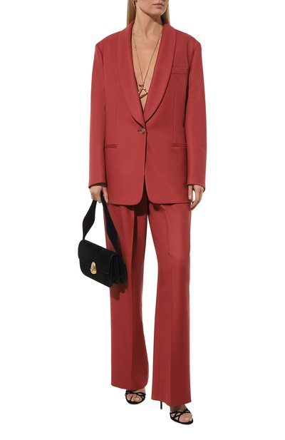 Босоножки с Т-образной перемычкой на подъеме выполнили из замши, а для подкладки использовали кожу. Модель на высокой шпильке дополнили сзади эластичным ремешком.