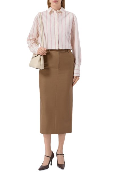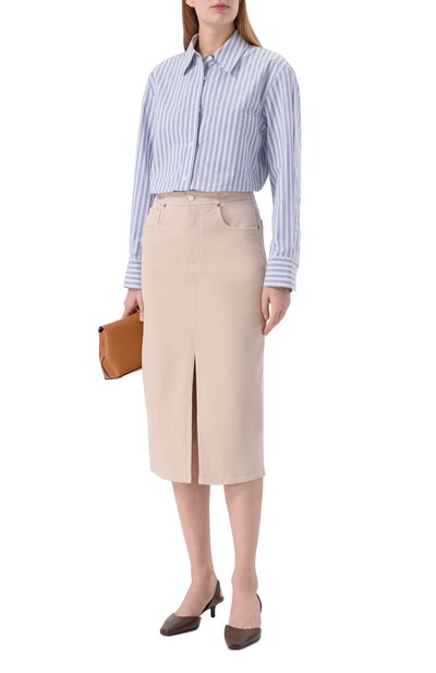 Прямую юбку с защипами сшили из гладкой хлопковой ткани стрейч. Модель с боковыми карманами и пуговичной планкой спереди украсили сзади тотемным орлом, вышитым нитью в тон.