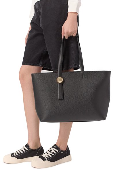 Для изготовления сумки MyEA с двумя ручками и текстильным брендированным ремнем использовали полимерный материал, напоминающий оленью кожу. Аксессуар с регулируемыми боковыми панелями на кнопках дополнили брелоком с логотипом и косметичкой на молнии.