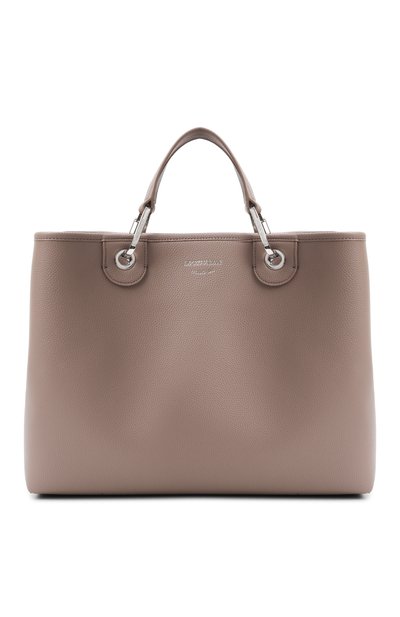 Сумку MyEA из напоминающего кожу полимера дополнили съемными ремнем и короткими ручками. Аксессуар, как и входящую в комплект косметичку, украсили логотипом, который нанесли в технике шелкографии спереди.