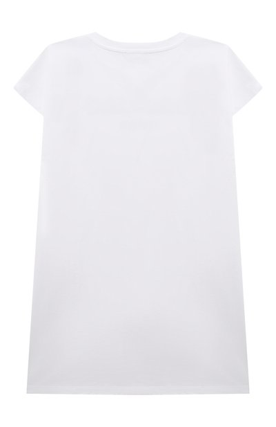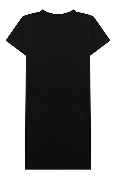 Платье-футболку с меланжевыми рукавами, напоминающее двухслойный комплект, сшили из хлопкового трикотажа. Спереди модель украсили логотипом из стразов разных форм и размеров.