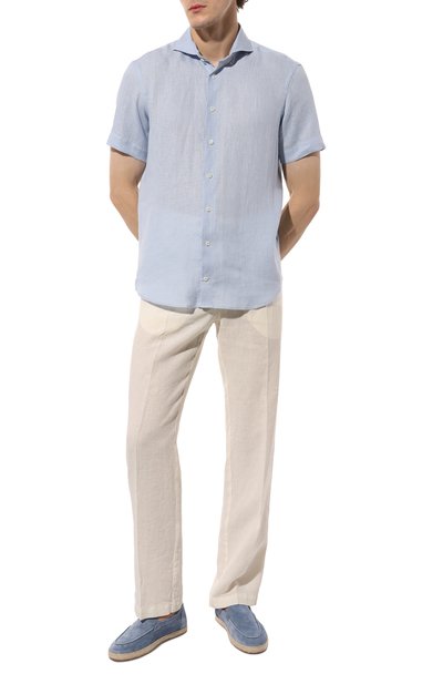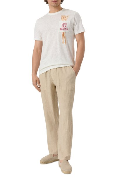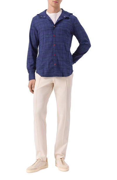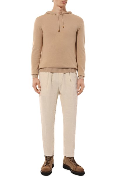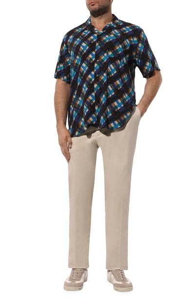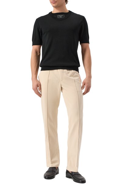 Брюки со стрелками сшили из эластичного хлопкового пике. Модель с поясом-кулиской дополнили парой карманов в боковых швах и двумя сзади. Предлагаем сочетать чиносы с джемпером и лоферами.