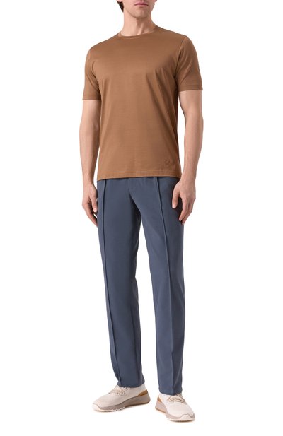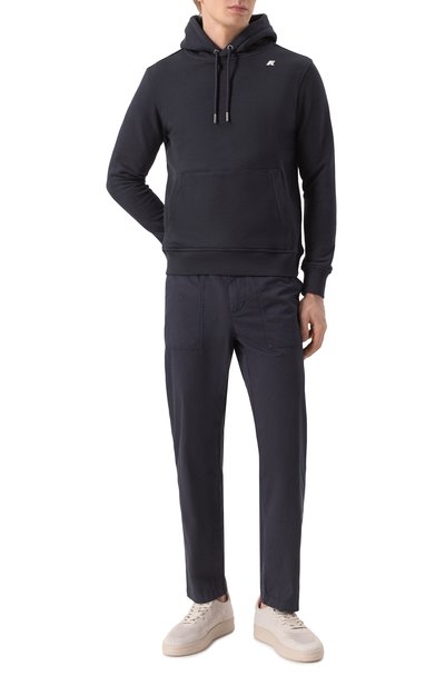 Брюки со стрелками сшили из хлопка с добавлением стрейчевых волокон. Модель с эластичным поясом-кулиской, регулируемым брендированным шнуром, дополнили боковыми и прорезными задними карманами.
