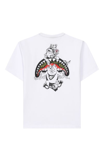 Футболку с неглубокой круглой горловиной сшили из хлопкового трикотажа. Спереди напечатали состаренный принт British Sailor.