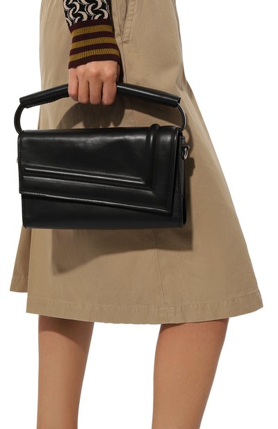 Полукруглую сумку с широкой стеганой ручкой, съемным плечевым ремнем и брендированным брелоком сшили из кожи. Аксессуар с внутренним карманом на молнии застегивается клапаном с потайными магнитными кнопками.