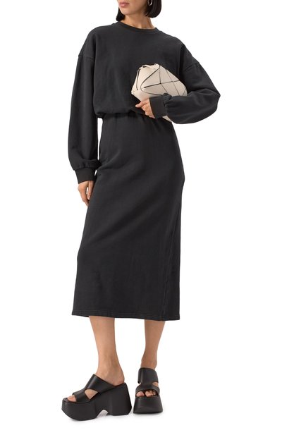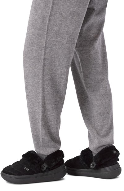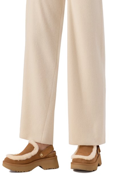 Для изготовления сабо с боковыми вырезами на перемычке и открытым мысом использовали гладкую кожу. Массивную полимерную платформу в тон украсили оттиском-логотипом сзади.