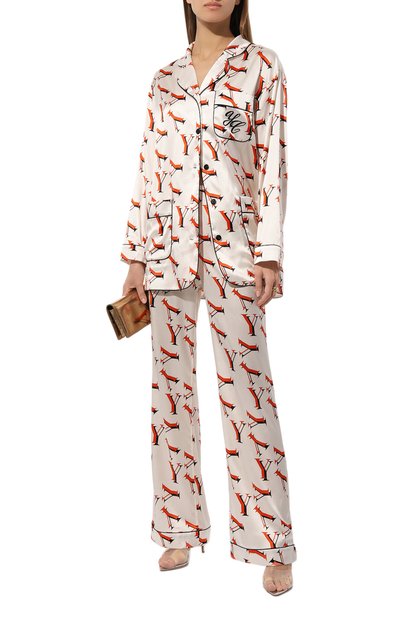 Удлиненную блузу с прямоугольными манжетами и фигурным асимметричным низом дополнили нагрудными карманами. Модель из полупрозрачного шелка в тройную жаккардовую полоску застегивается потайными пуговицами. В комплекте — пояс-лента, который можно повязать как галстук.