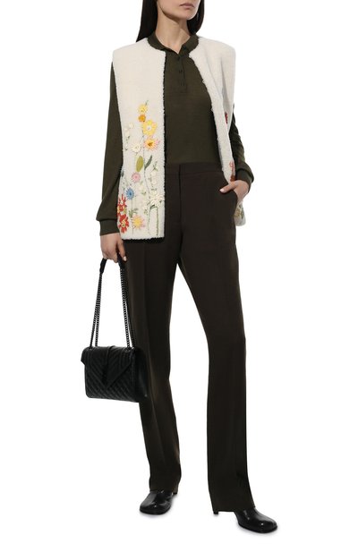 Утепленный пухом двусторонний жилет с высоким воротом и парными боковыми карманами застегивается встречной молнией. Стеганую сторону модели сшили из клетчатого твида на основе шерсти и кашемира, гладкую — из нейлона. Из него же выполнили съемный брендированный капюшон.