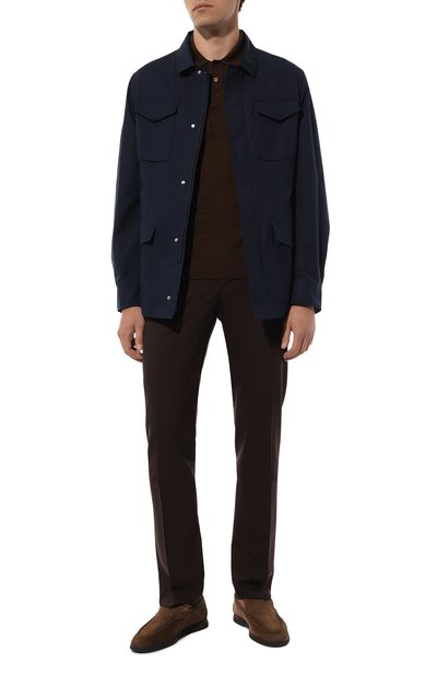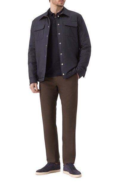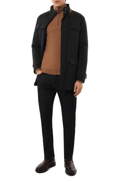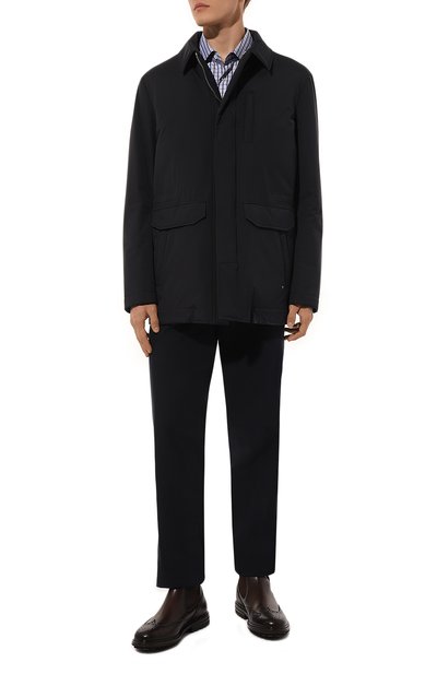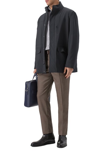Куртку с воротником-стойкой, усиленным замшевой отделкой, дополнили регулируемыми патами на рукавах, а также внутренним и четырьмя внешними карманами с клапанами. Модель со скрытым поясом-кулиской сшили из непродуваемого полиэстера. Молнию скрыли штормовой планкой с потайными кнопками.