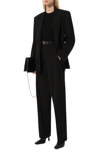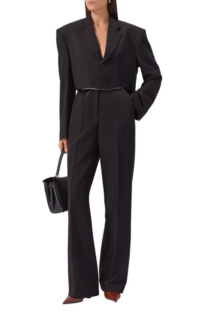 Слегка укороченный жакет с вискозным подкладом и атласными лацканами выполнили из плотной шерсти grain de poudre. В модели предусмотрели потайные пуговицы и карманы в боковых швах.