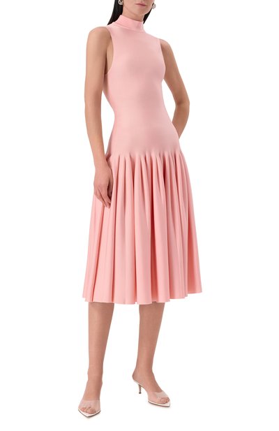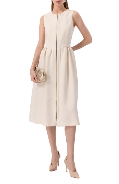 Платье с объемным асимметричным подолом сшили из органического хлопкового поплина. Модель с драпировкой на горловине и двумя карманами в боковых швах застегивается потайной молнией сзади.