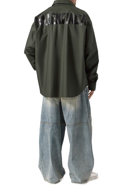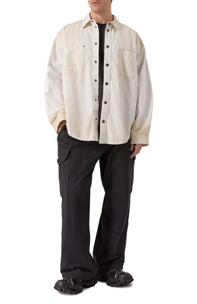 Рубашка прямого кроя сшита из хлопкового твила, укрепленного полиэстером. Модель со спущенной линией плеч и широкой кокеткой застегивается потайными кнопками.