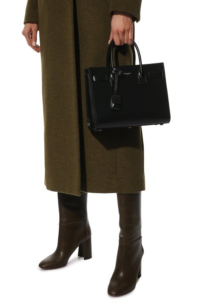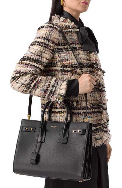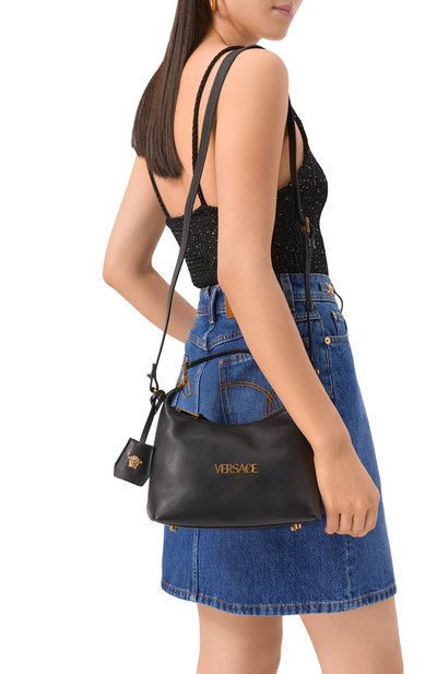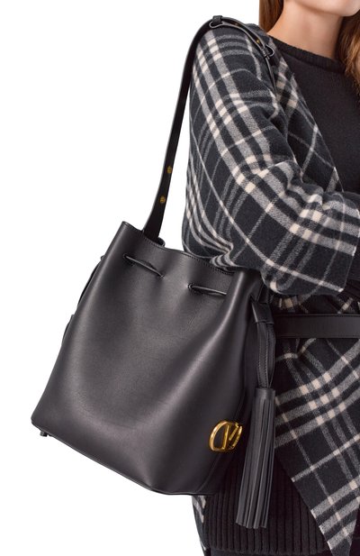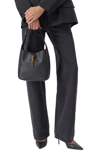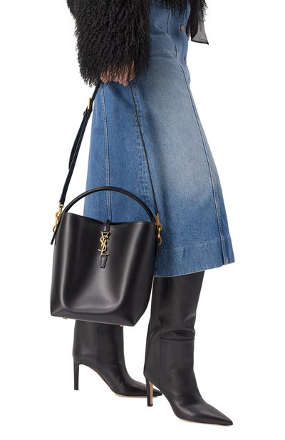 Сумку-ведро Le 37 с широкой ручкой и съемным регулируемым ремнем изготовили из гладкой кожи ягненка. Аксессуар с пуклями на дне и внутренней отделкой из замши закрывается застежкой-крючком в форме эмблемы Кассандра.