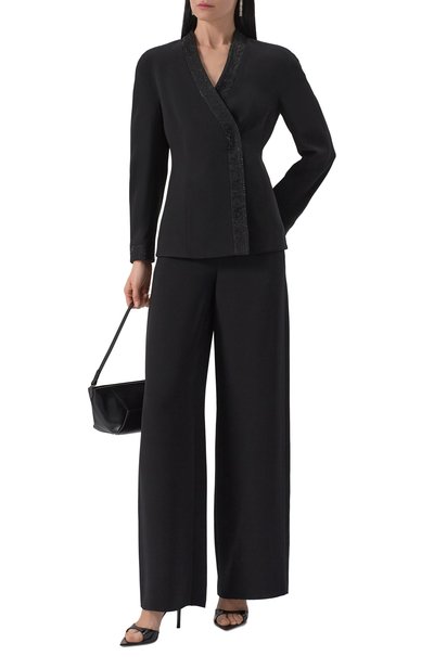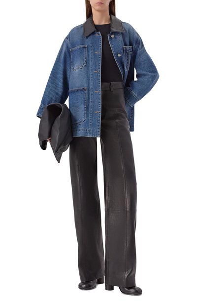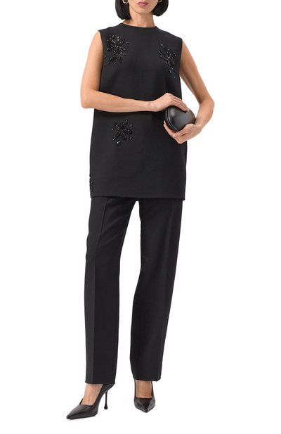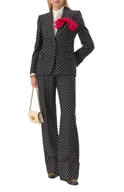 Слегка укороченные брюки с высокой посадкой сшили из наппы плонже. Модель с пятью карманами дополнена по бокам ремешками с фирменными пряжками Medusa '95, с которыми перекликается крупная пуговица. Сзади на поясе – патч с логотипом марки.