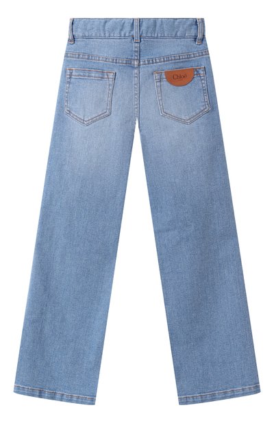 Прямые джинсы с потайной регулируемой эластичной лентой на поясе выполнили из жесткого хлопка. Самый маленький из пяти карманов украсили заклепкой Medusa, а сзади расположили патч Versace Kids.