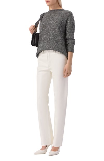 Свитер с круглым вырезом, манжетами и широким поясом в рубчик выполнен из шерсти с добавлением кашемира. Левый рукав украшен небольшой фирменной монограммой, вышитой нитью в тон.