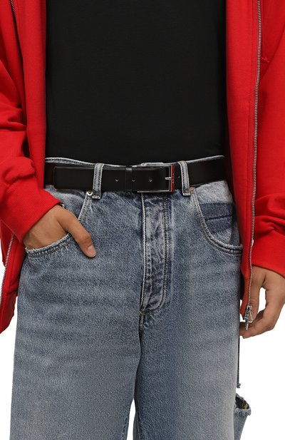 Широкий ремень выполнили из гладкой кожи. Аксессуар со строчкой фирменного алого оттенка вокруг шлевки застегивается пряжкой с выгравированным логотипом.