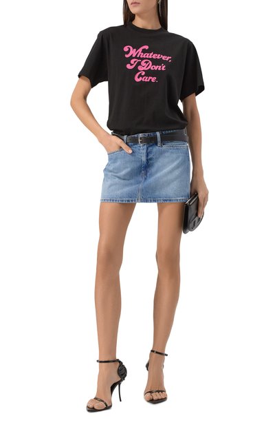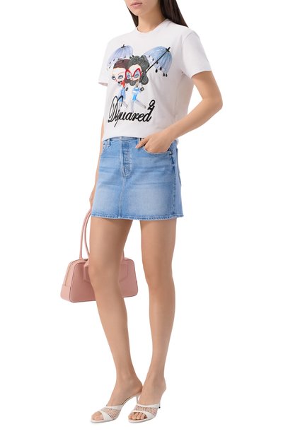 Асимметричную мини-юбку из выбеленного денима дополнили отворотом спереди, акцентированным брендированной нашивкой с горным пейзажем. На поясе модели с пятью карманами закрепили фирменный патч.